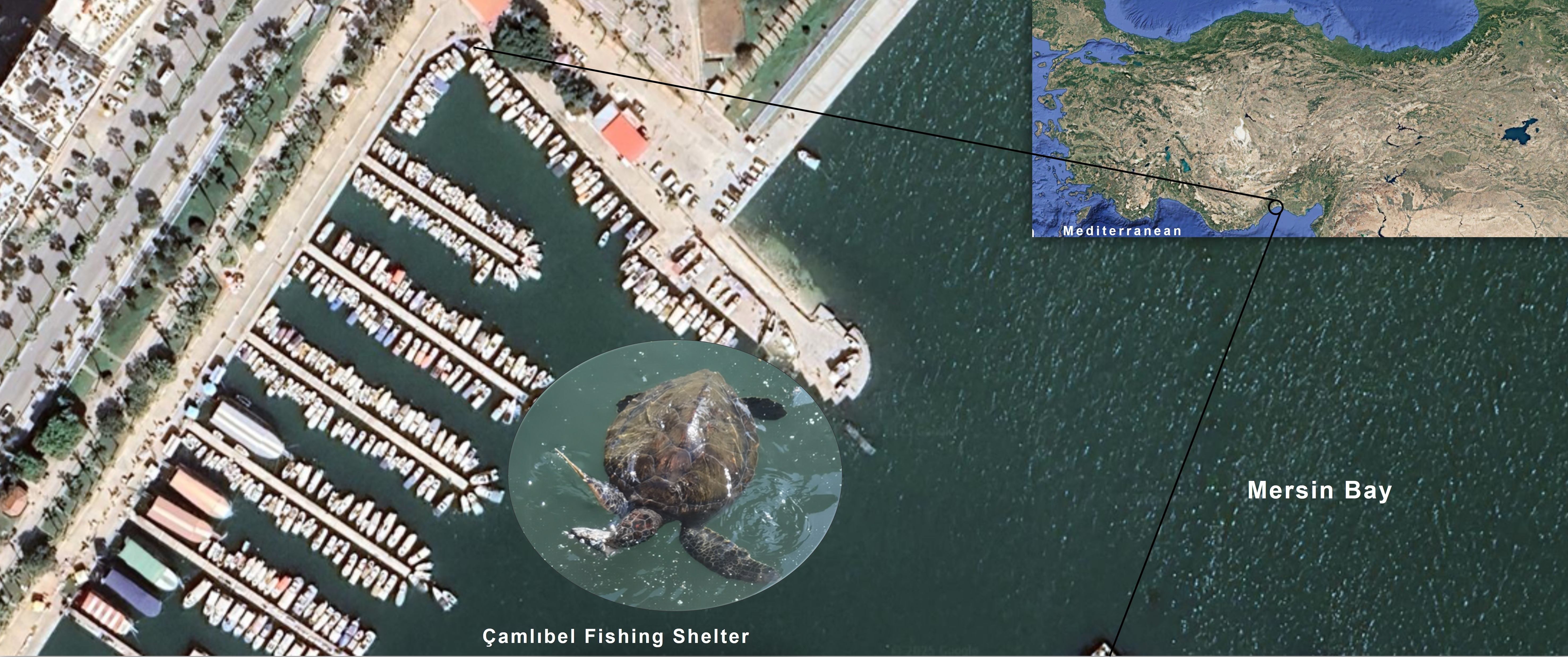 This study was conducted to identify the turtles and their frequency of visiting at the Çamlıbel Fishing Shelter in Mersin Bay (northeastern Mediterranean) between October 2023 and January 2024. During this period, green sea turtle Chelonia mydas, typically herbivorous, were observed feeding on bycatch species discarded from fishing nets and fish waste from restaurant boats for the first time. The change in feeding behavior of green sea turtles introduced to the area was confirmed through visual recordings and interviews with restaurant staff and fisherman. The study also reported the arrival of the loggerhead sea turtle Caretta caretta and the Nile softshell turtle Trionyx triunguis in the area. Habitat destruction in Mersin Bay, caused by anthropogenic factors such as intensive fisheries and tourism activities, has prompted sea turtles to adopt opportunistic feeding strategies, potentially disrupting their ecological balance and survival. This shift highlights the adaptability of green sea turtles to environmental changes and underscores the need to monitor how human impacts affect the feeding and migration of sea turtles to improve conservation efforts.